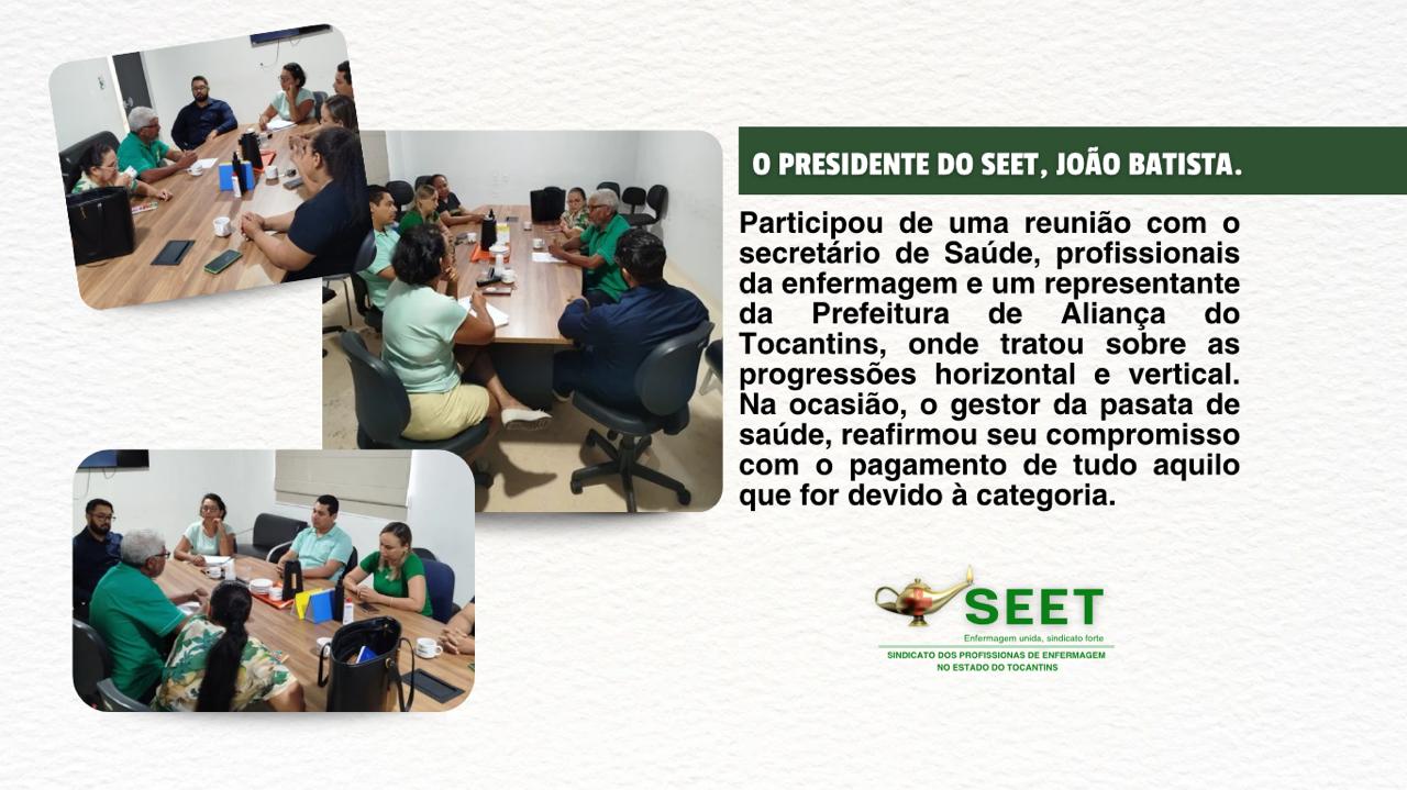 O presidente do SEET, João Batista, participou de uma reunião estratégica com o secretário de Saúde do município de Aliança do Tocantins, Antônio Monteiro da Silva, profissionais da enfermagem e mais um representante da Prefeitura, onde o tema central foi o pagamento do piso da categoria e a situação das progressões para a categoria.