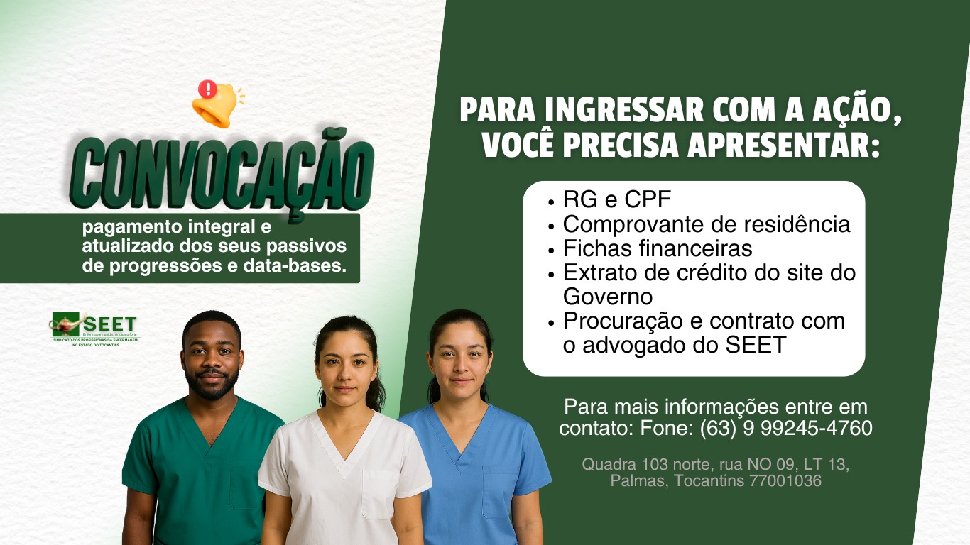 O Sindicato dos Profissionais da Enfermagem no Estado do Tocantins (SEET) informa aos servidores que o Governo do Estado reconheceu os passivos referentes às progressões e data-bases, porém está realizando o pagamento de forma parcelada e sem a devida correção monetária.