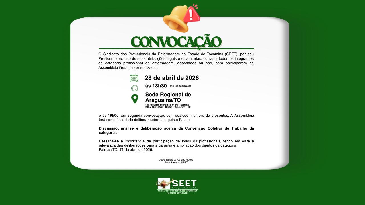 O Sindicato dos Profissionais da Enfermagem no Estado do Tocantins (SEET), por seu Presidente, no uso de suas atribuições legais e estatutárias, convoca todos os integrantes da categoria profissional da enfermagem, associados ou não, para participarem da Assembleia Geral, a ser realizada no dia 28 de abril de 2026, na Sede Regional de Araguaína/TO, às 18h30, em primeira convocação, com a presença da maioria dos interessados, e às 19h00, em segunda convocação, com qualquer número de presentes.