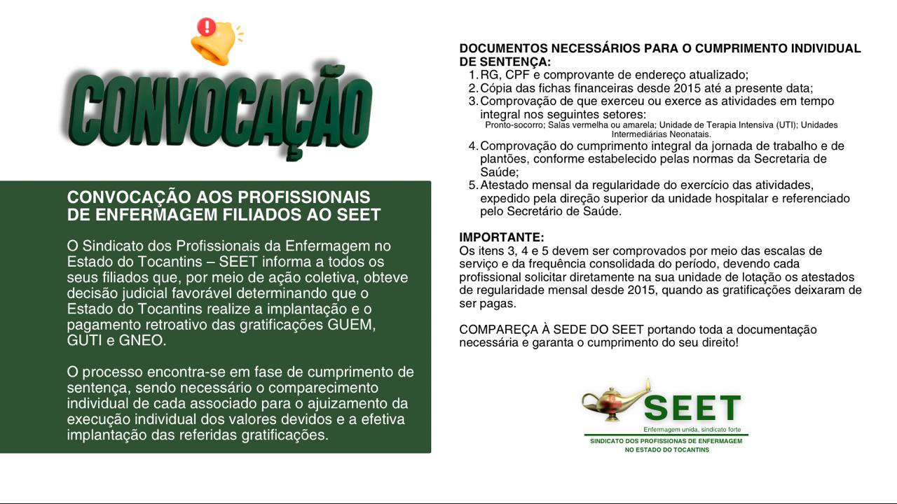 O Sindicato dos Profissionais da Enfermagem no Estado do Tocantins – SEET informa a todos os seus filiados que, por meio de ação coletiva, obteve decisão judicial favorável determinando que o Estado do Tocantins realize a implantação e o pagamento retroativo das gratificações GUEM, GUTI e GNEO.