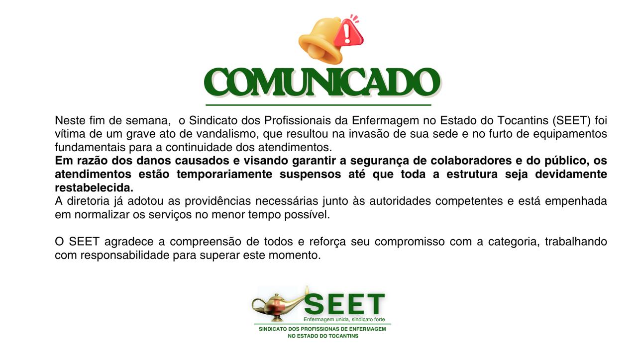 Neste fim de semana, o Sindicato dos Profissionais da Enfermagem no Estado do Tocantins (SEET) foi vítima de um grave ato de vandalismo, que resultou na invasão de sua sede e no furto de equipamentos fundamentais para a continuidade dos atendimentos.